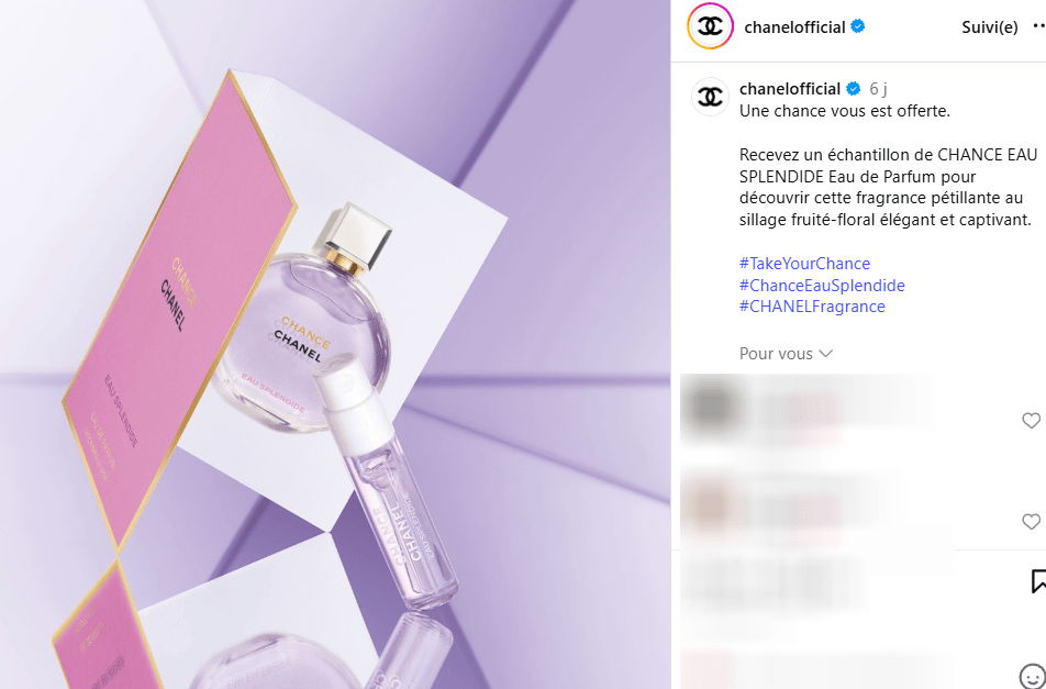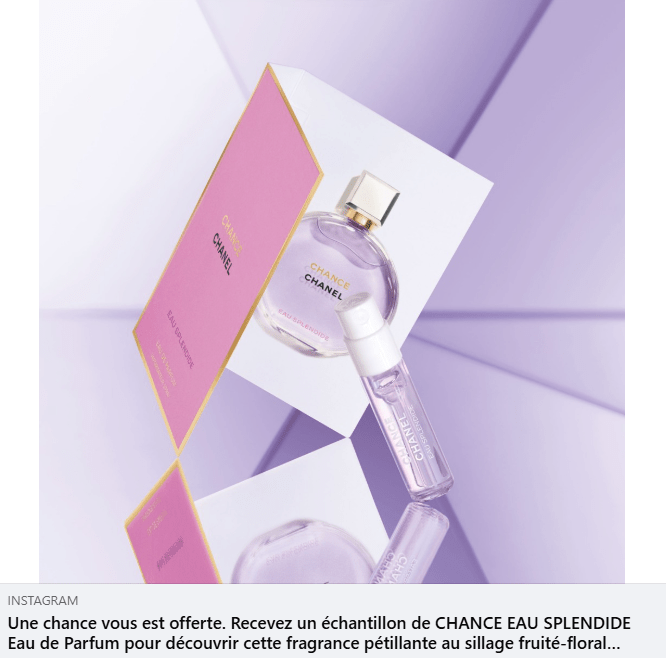 Pour Tenter d’obtenir votre échantillon gratuit rendez-vous sur la page instagram Chanelofficial, abonnez-vous gratuitement à la page instgram aimez plusieurs posts de leur page, si vous faite partis des personnes cible vous devriez voir apparaitre l’offre sur fil instagram.