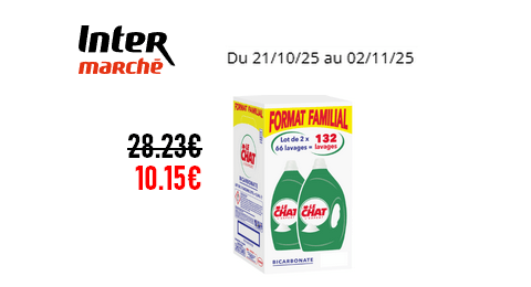 En ce moment dans les magasins Intermarché vous pouvez obtenir la Lessive Liquide Le Chat 132 Lavages à 10.15€.