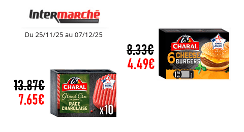 – 6 Cheese Burgers Charal à 8.33€ – 34% de remise sur la carte fidélité = 5.49€ – 1€ bon de réduction = 4.49€