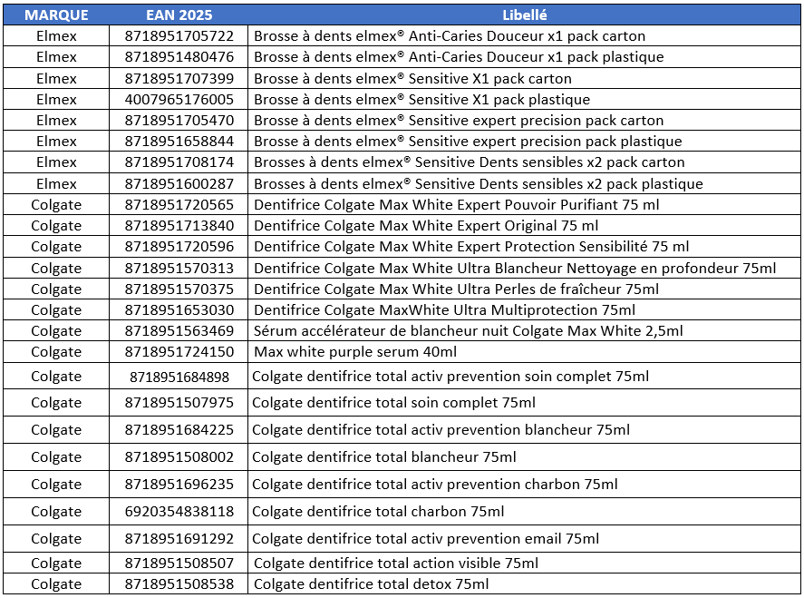 Achetez en magasin, entre le 29/09/2025 et le 15/12/2025 inclus, une brosse à dents adulte ELMEX ou un dentifrice COLGATE parmi les références citées ci-dessus